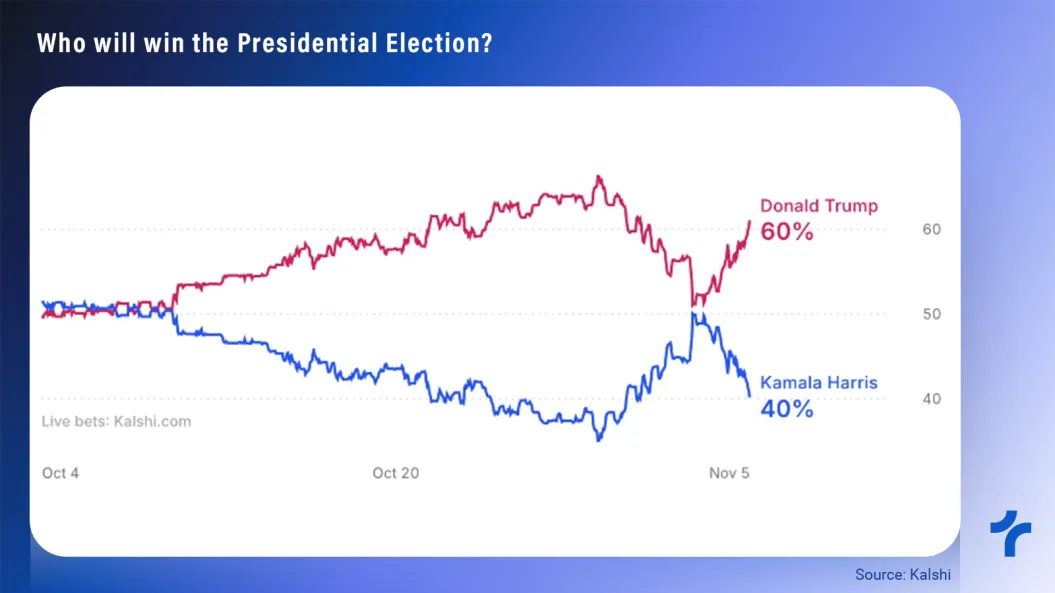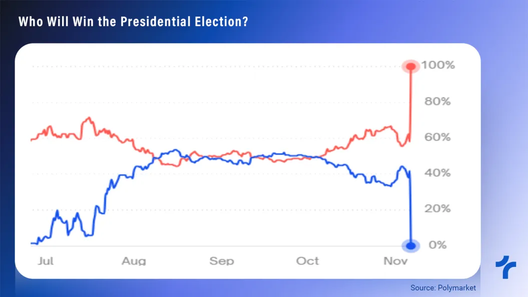 On the other hand, predictions from decentralized markets were far more accurate, providing real-time probability updates. For instance, on Polymarket, where prices fluctuate constantly, the chances of Trump winning were around 60% right before the vote count.