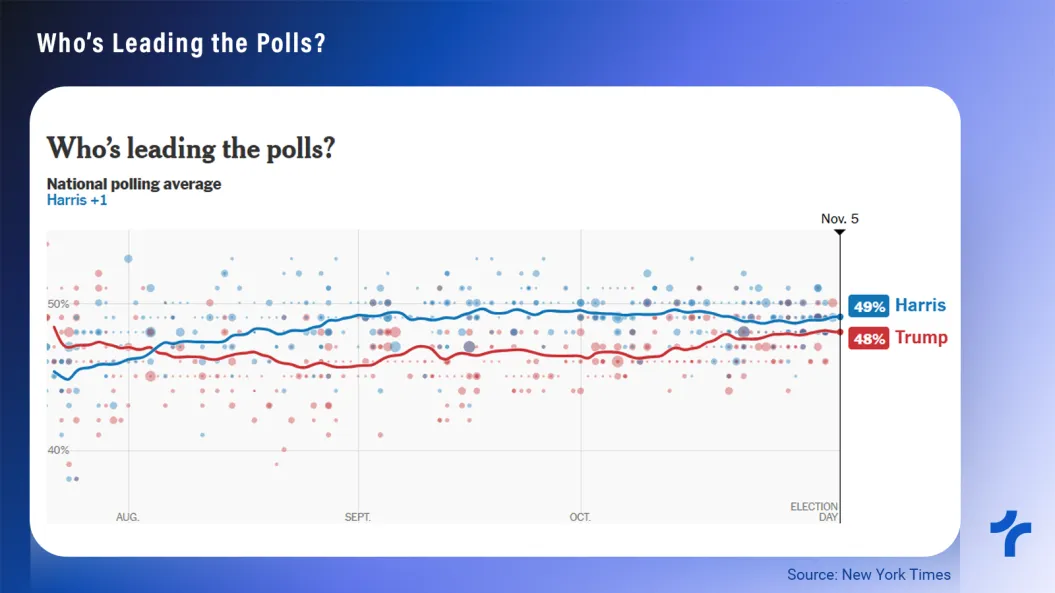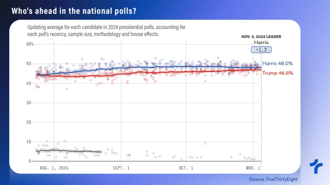 Polls fluctuated significantly in the weeks leading up to the election, but in most of them, Kamala Harris appeared as the favorite to win, holding a lead of over 5 percentage points at certain times.