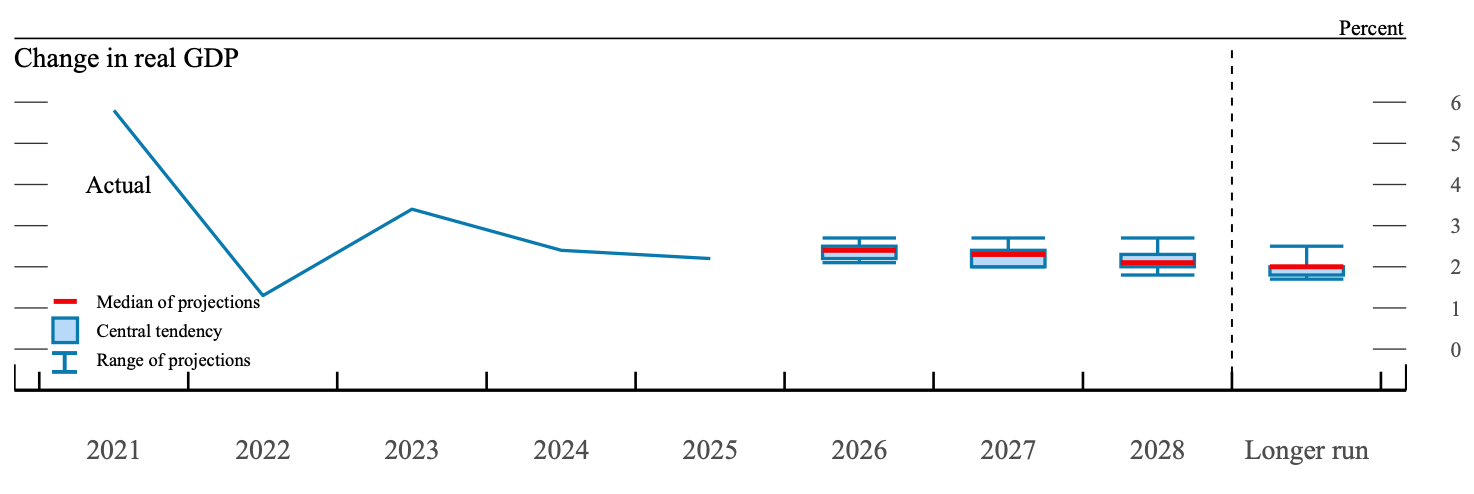 The median projection for real GDP growth (Q4-over-Q4) was revised upward to 2.4% for 2026 (from 2.3% in December), 2.3% for 2027 (from 2.0%), and 2.1% for 2028 (from 1.9%). The longer-run median also rose to 2.0% (from 1.8%).