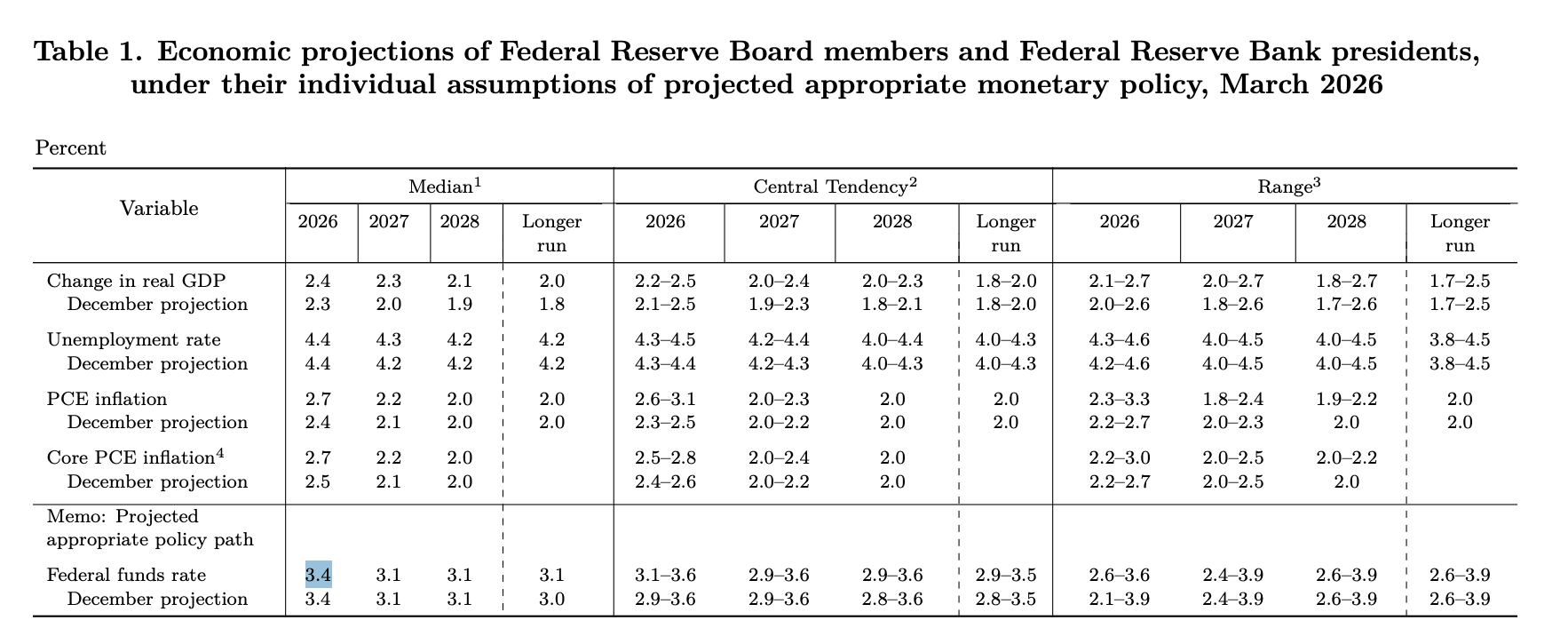Compared with the December 2025 projections, the March update shows modestly stronger expected GDP growth and noticeably higher near-term inflation, while the median interest-rate path remains unchanged in the near term and edges only slightly higher over the longer run.
