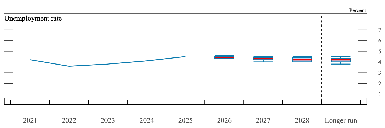 This stability contrasts with the upgrades to growth and inflation, implying the Fed continues to view the labor market as resilient and near its estimated longer-run natural rate of 4.2%, with no material softening expected despite stronger growth forecasts.