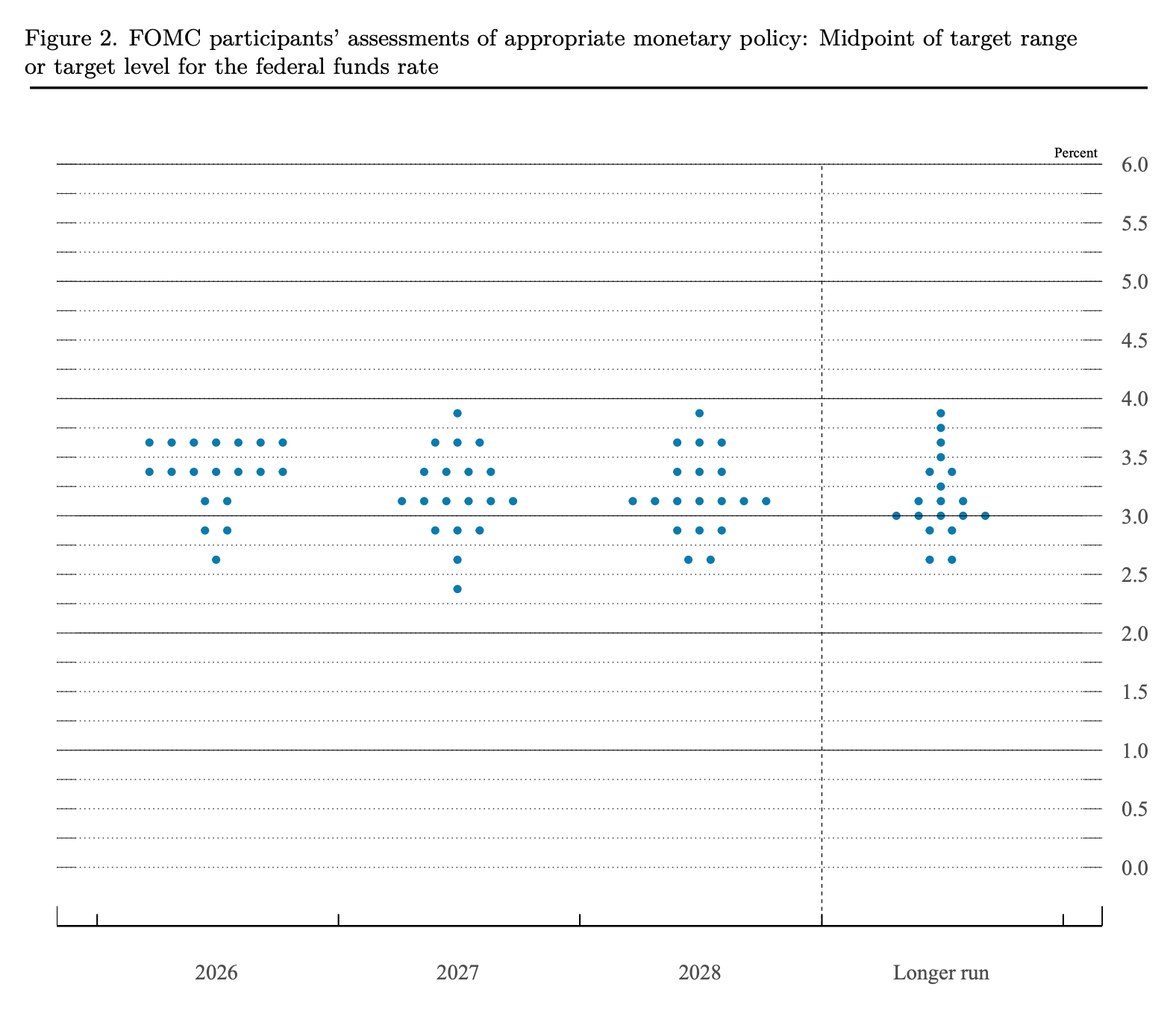 The median projected federal funds rate (end-of-year target midpoint) is unchanged at 3.4% for end-2026, 3.1% for 2027, and 3.1% for 2028. The longer-run neutral rate ticked up 0.1 percentage point to 3.1% (from 3.0%).