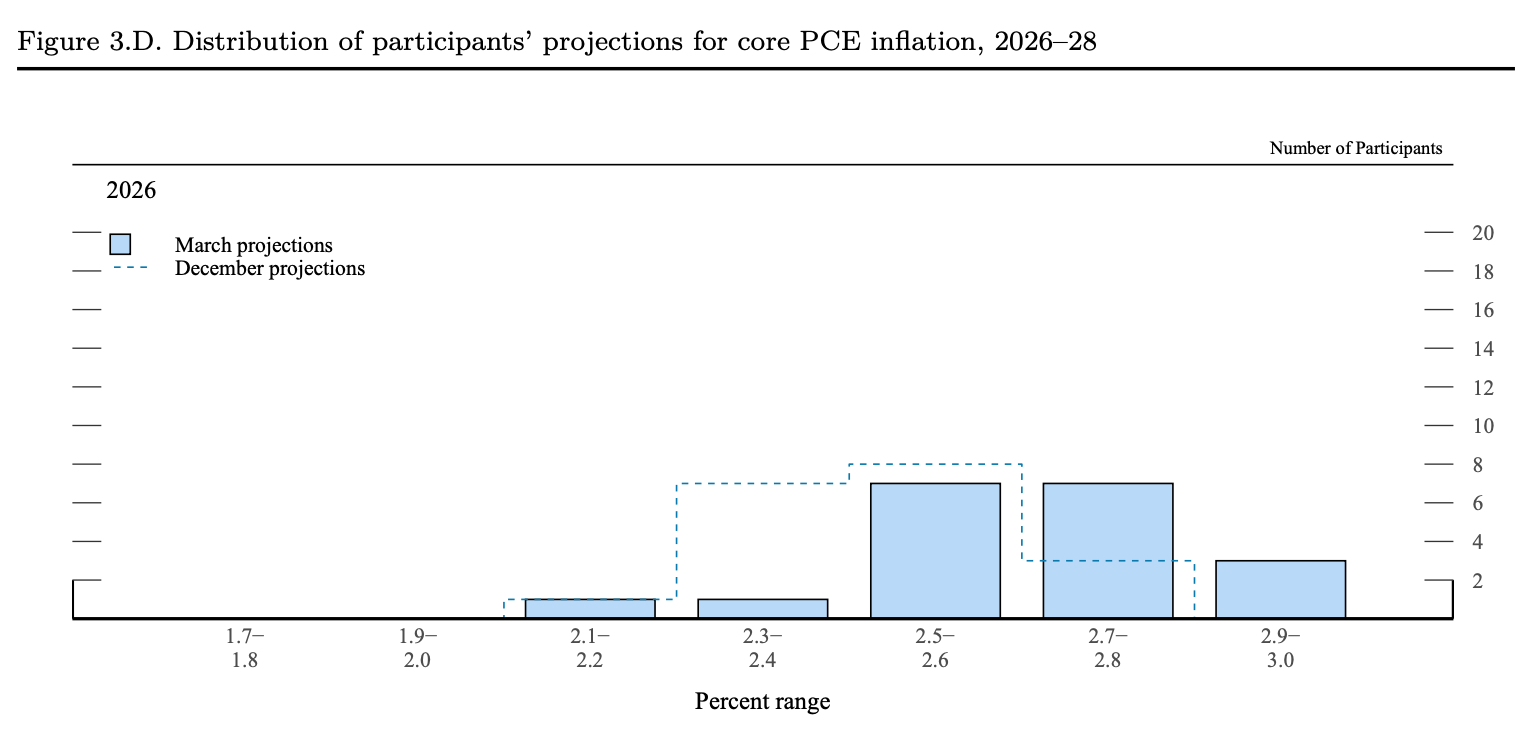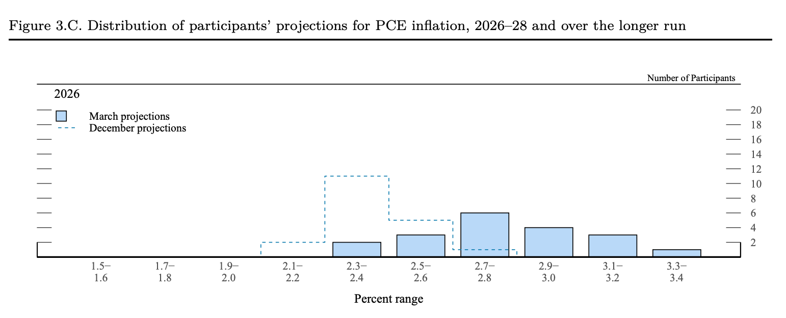 This is the most significant shift in the March projections. The median for headline PCE inflation in 2026 rose 0.3 percentage points to 2.7% (from 2.4% in December), the largest single-year upward revision in recent cycles. Core PCE inflation (excluding food and energy) was also marked up 0.2 percentage points to 2.7% for 2026 (from 2.5%).