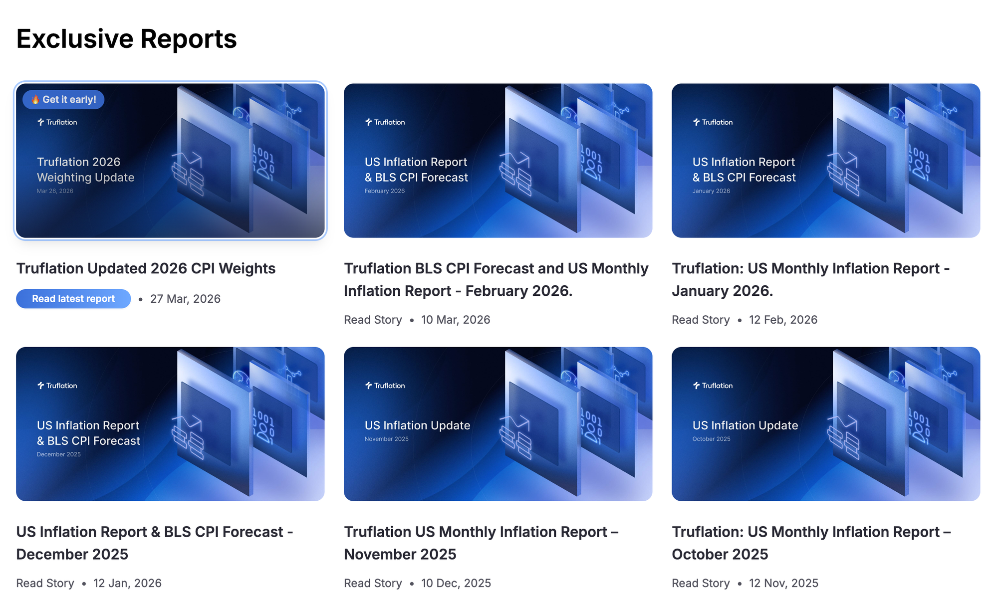 You can access Truflations Inflation Report monthly on your user dashboard in the Reports section. Use the credits included with subscription packages to access the report early and get a head start before the official numbers hit the wires.