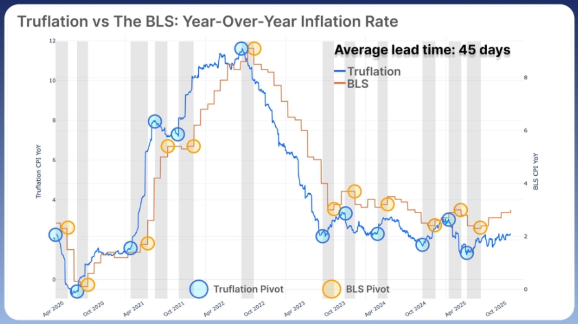 - Our precise BLS CPI prediction based on Truflation's indicators leading the CPI numbers by an average of 45 days.