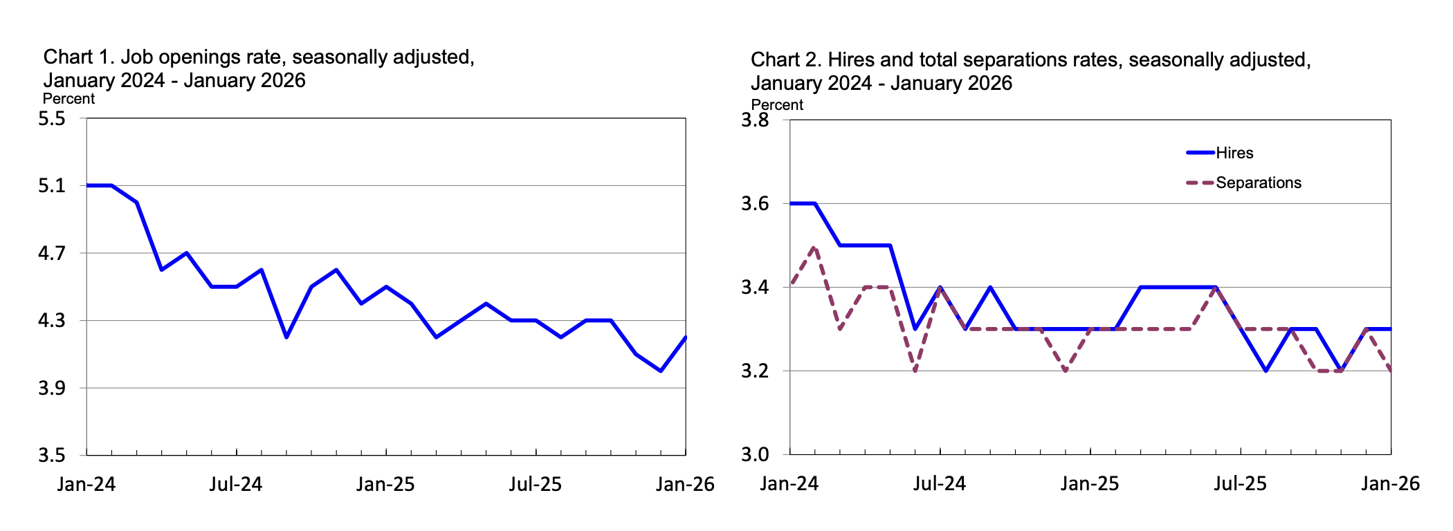 Within separations: quits 3.1 million (2.0% rate), layoffs and discharges 1.6 million (1.0% rate), both little changed.