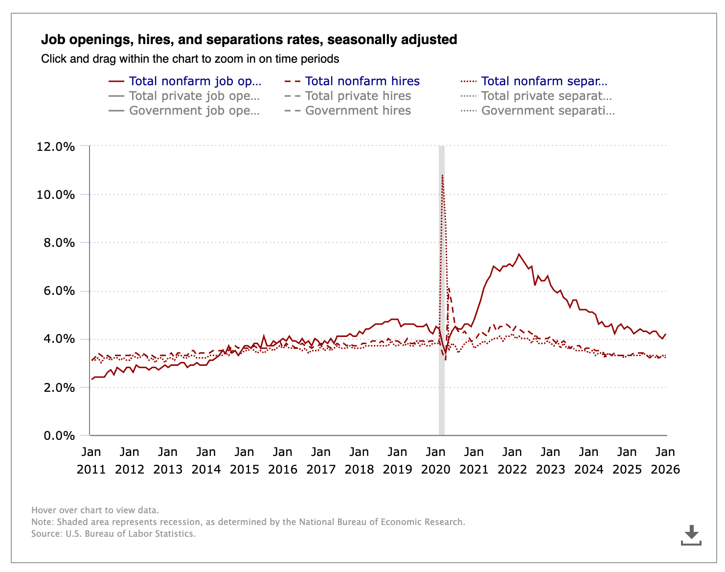 The latest JOLTS (Job Openings and Labor Turnover) are out for January 2026 (from the BEA).