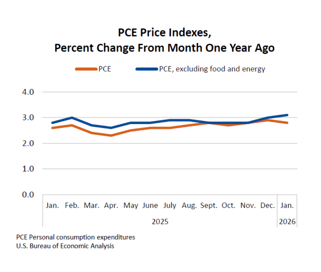 The PCE (Personal Consumption Expenditures) index came in cooler for January at 2.8% year-over-year, slightly below expectations, while core PCE inflation increased by 3.1% year-over-year, in line with market expectations.
