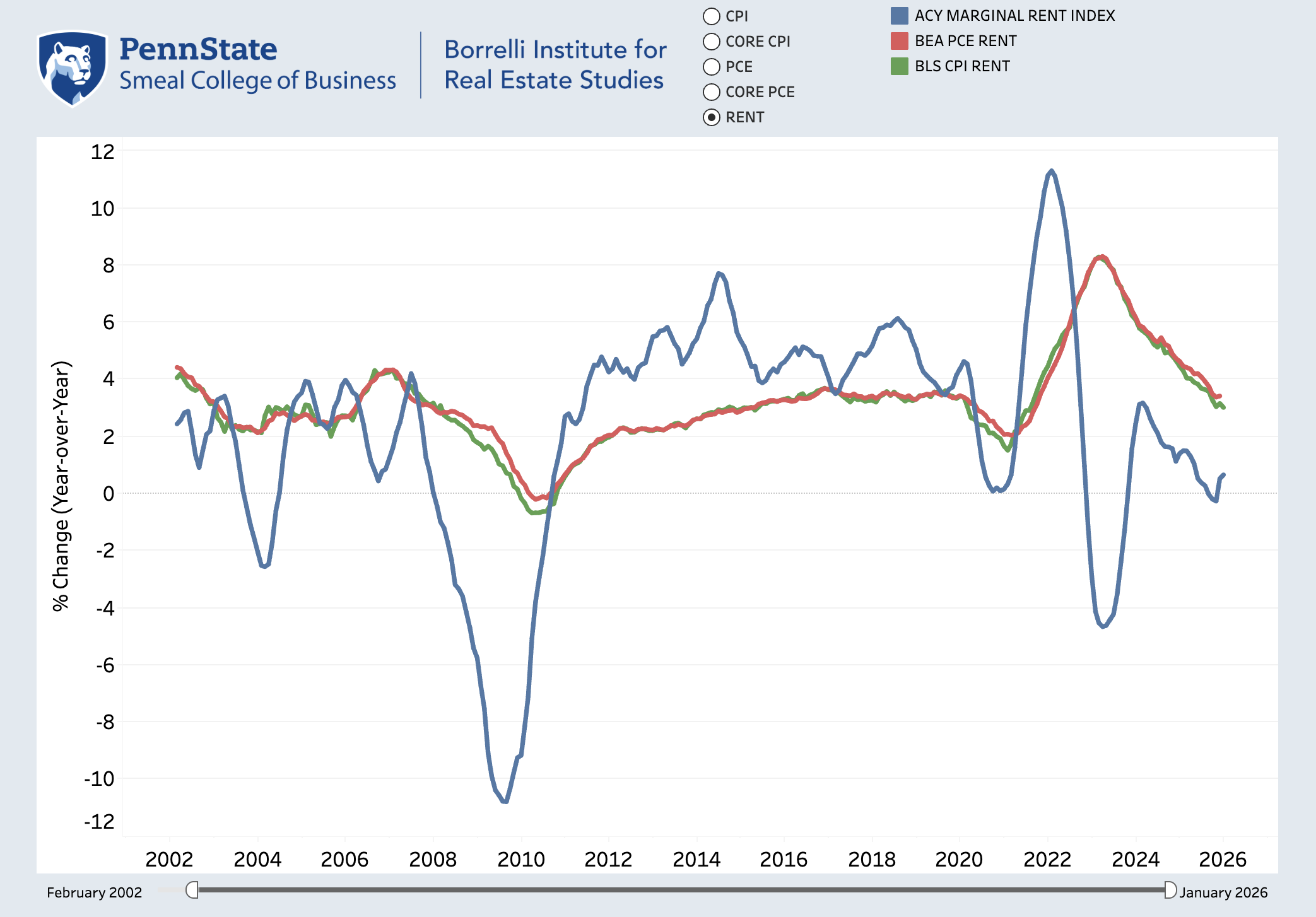 Unlike real-world rent indexes, both the BEA and the BLS household-survey rent indexes do not capture larger price shifts or real-world conditions in the housing market, as shown in multiple research publications from Penn State University, with rent price fluctuations delayed by months and significantly flattened.