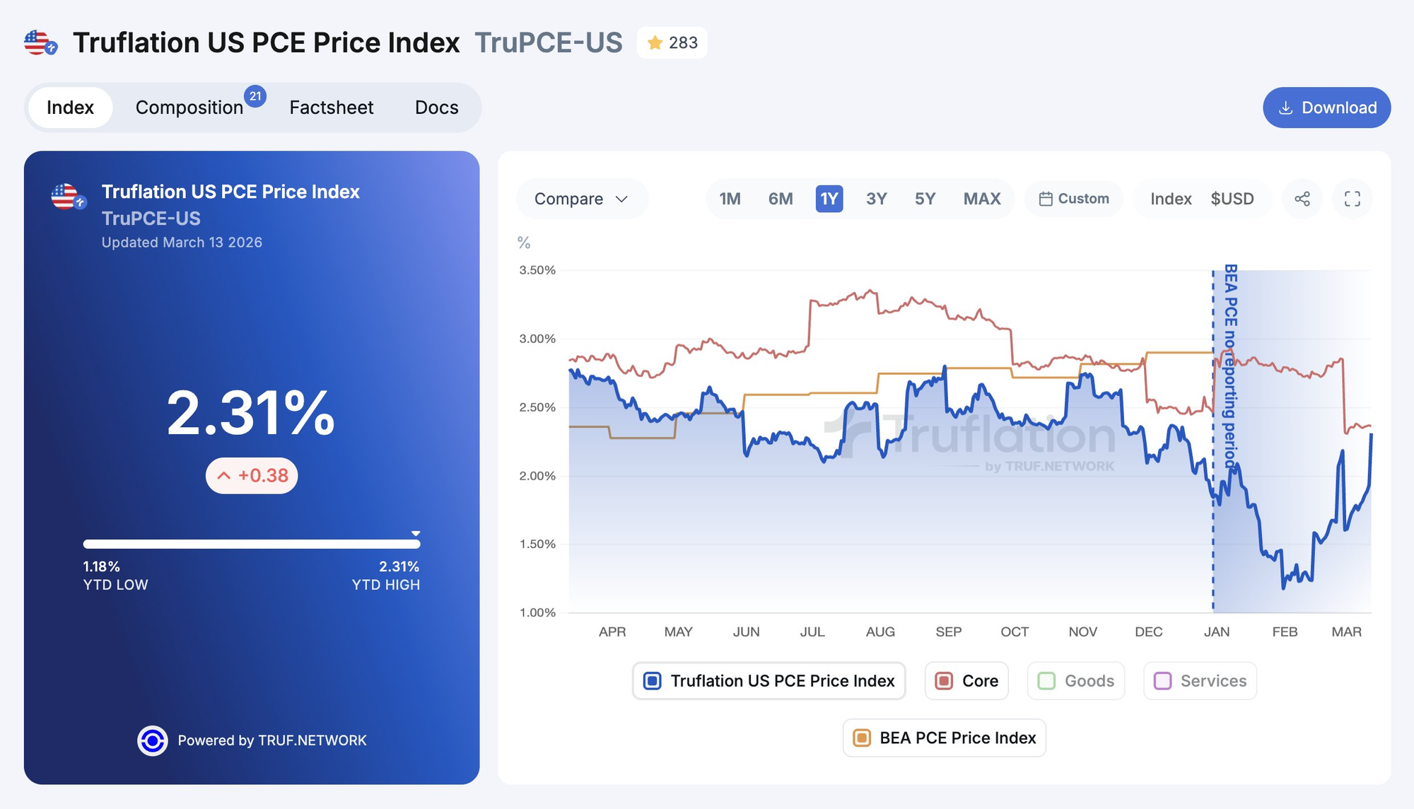 While the official CPI and PCE remain flat, not responding to current global uncertainty around oil and shipping, Truflation's real-time data show that PCE dipped significantly in January and February from its 2025 highs, before rebouncing strongly 2.31% Y/Y and 2.4% for Core PCE today, amidst the Middle East crises and skyrocketing oil prices.