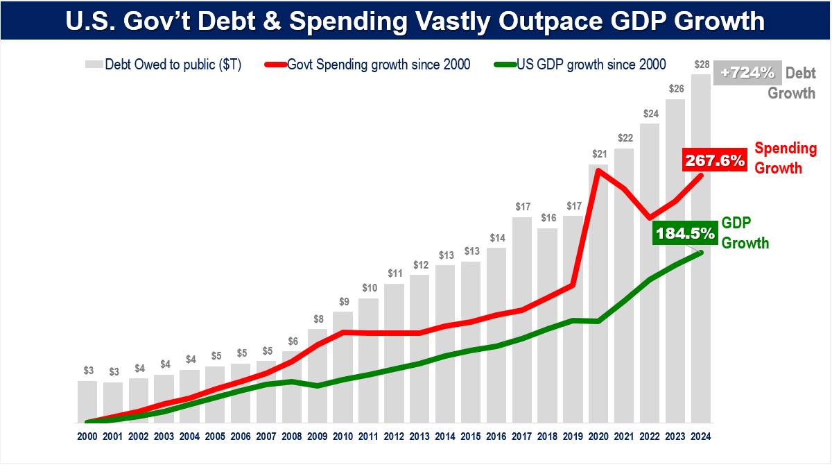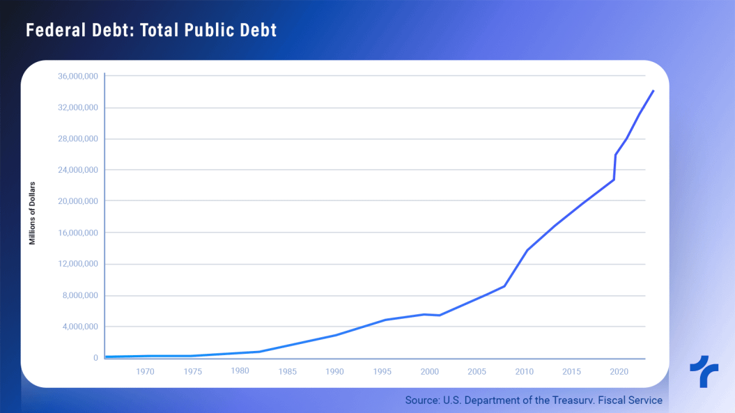 This is another major concern. Government spending is growing at an accelerated pace, and at current levels, the cost of debt is high. The following chart shows that since the 2000s, debt growth has been increasing exponentially.