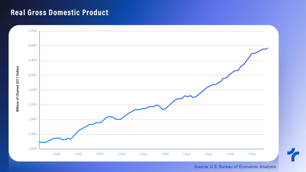 - Real GDP growth was higher during the 1950s. However, the pandemic negatively impacted the current period. If the economy continues to grow, the coming years could rival that of the previous golden age.