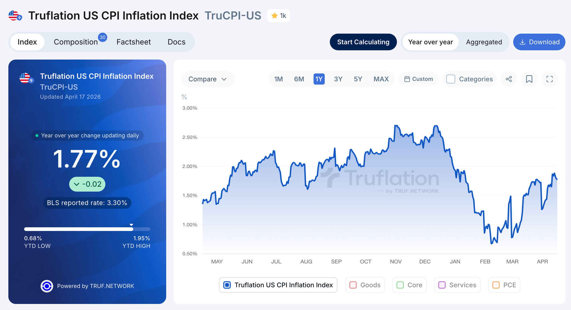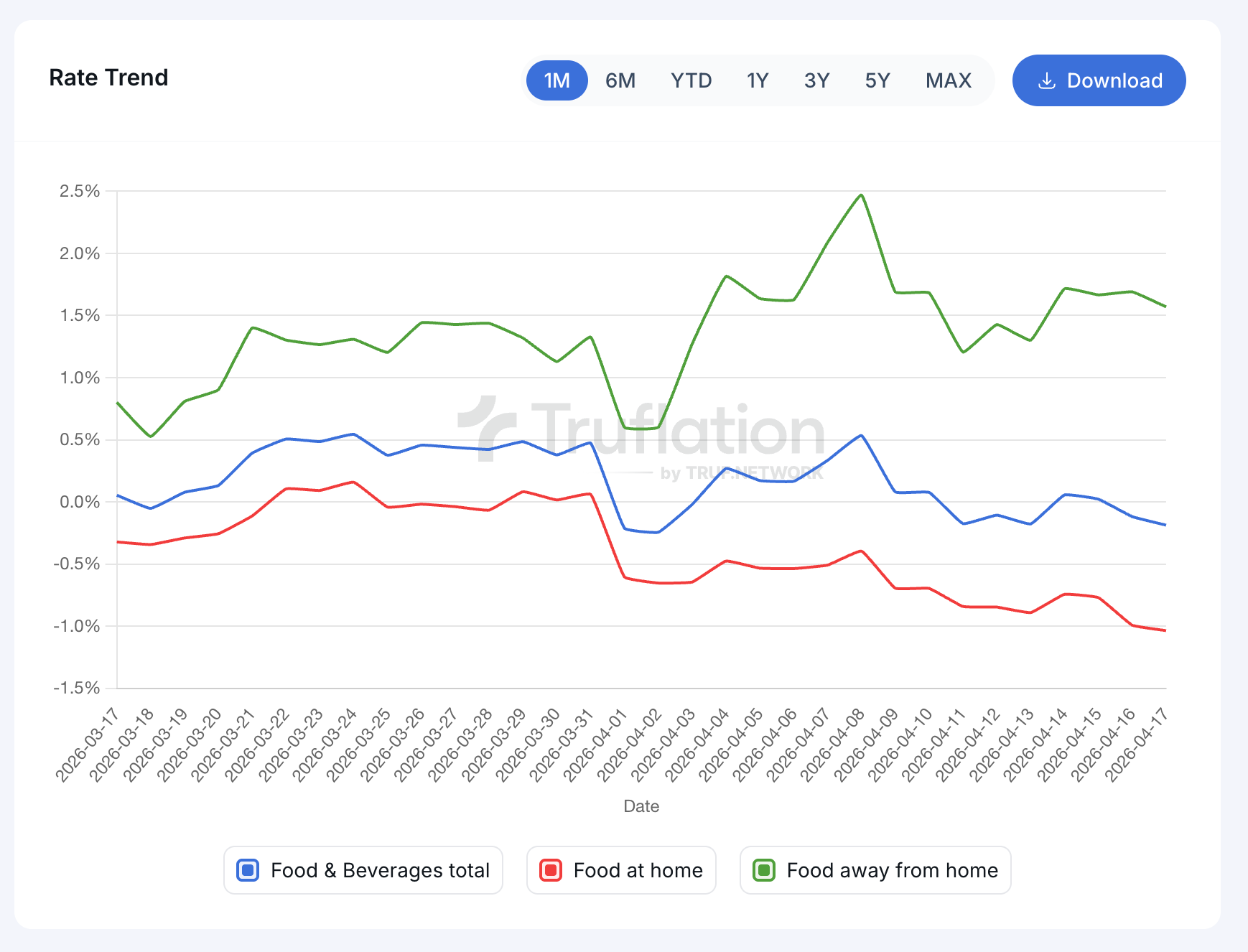 US inflation today was 1.77% year-over-year (as of April 17, 2026). The drop from 1.88% only 3 days ago was mainly driven by food prices. Food & Beverages total and Food at Home were both back in deflation this week.