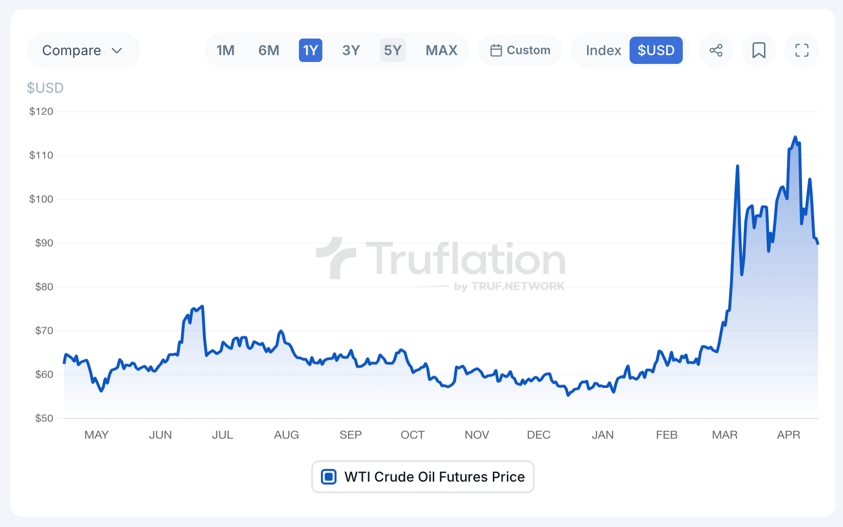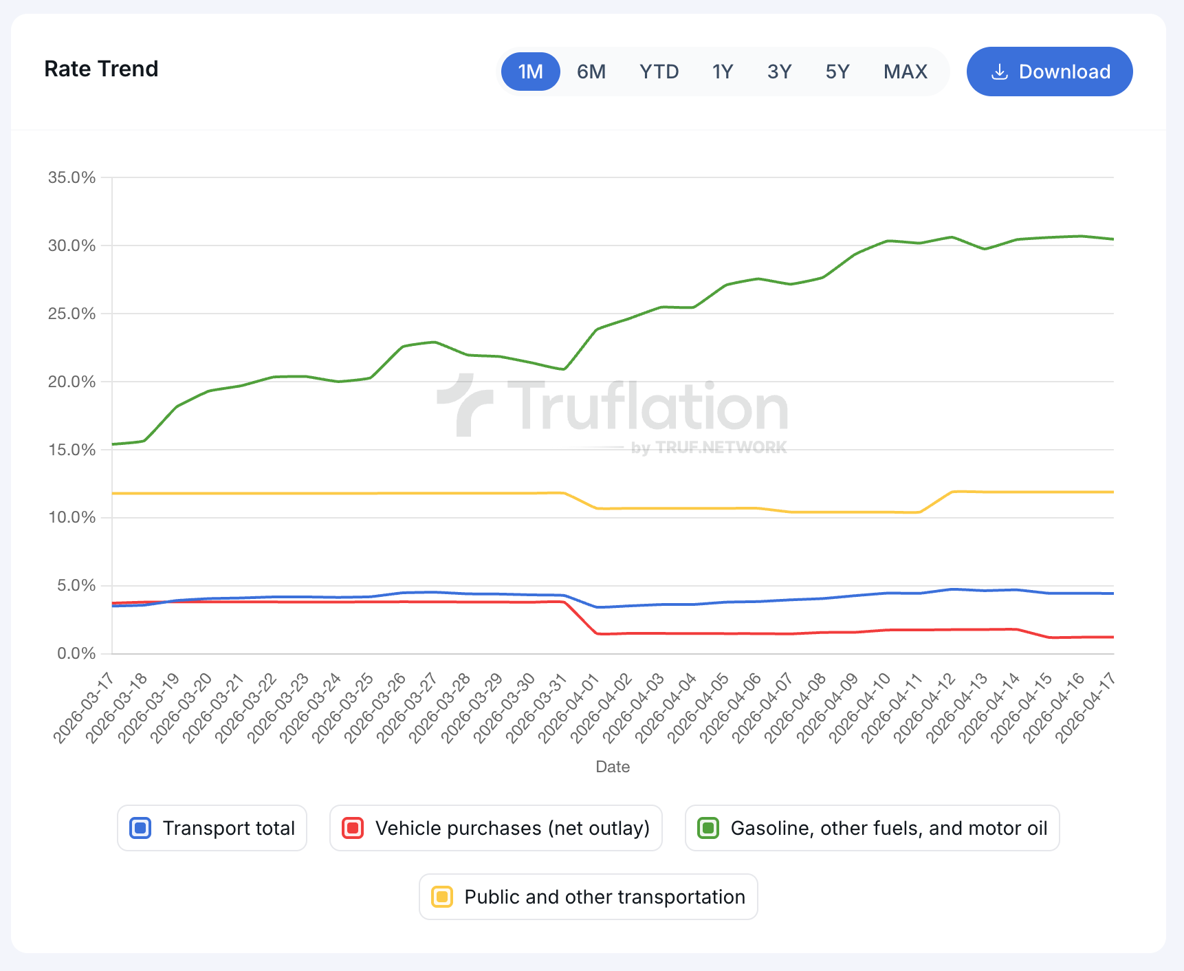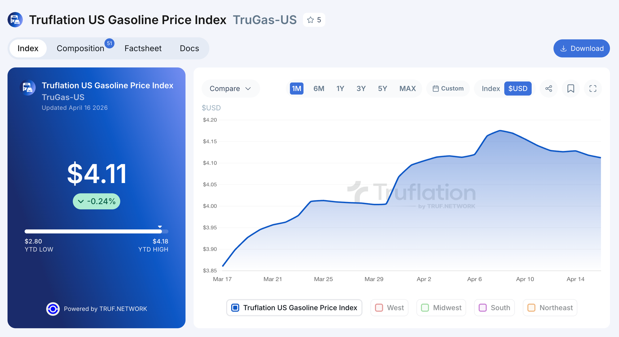 Dropping oil prices are already having a positive effect on gasoline prices at the pump. Truflation's US Gasoline Price Index registered its first drop as of April 9, only 2 days after oil reversed its trend.