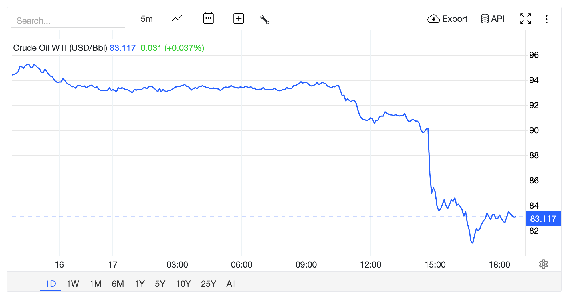 Crude oil went from as high as $116 on April 7, only 10 days ago, to $94 yesterday and briefly below $81 on April 17. Brent went from $111 as of April 7 to as low as ~$86 on April 17.