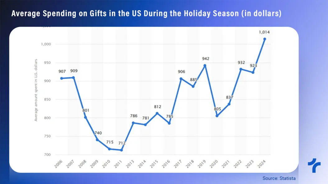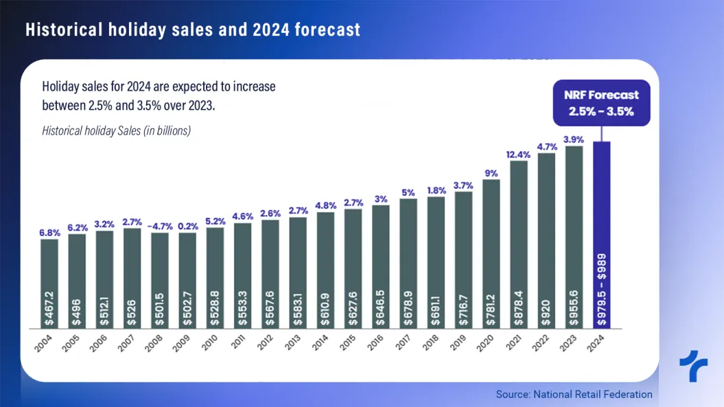 Last year was already a period of growth. Around $955 billion in retail sales were recorded for the 2023 holiday season (November to December), representing an increase from previous years, primarily driven by an 8-9% bump in online sales, according to the National Retail Federation (NRF).