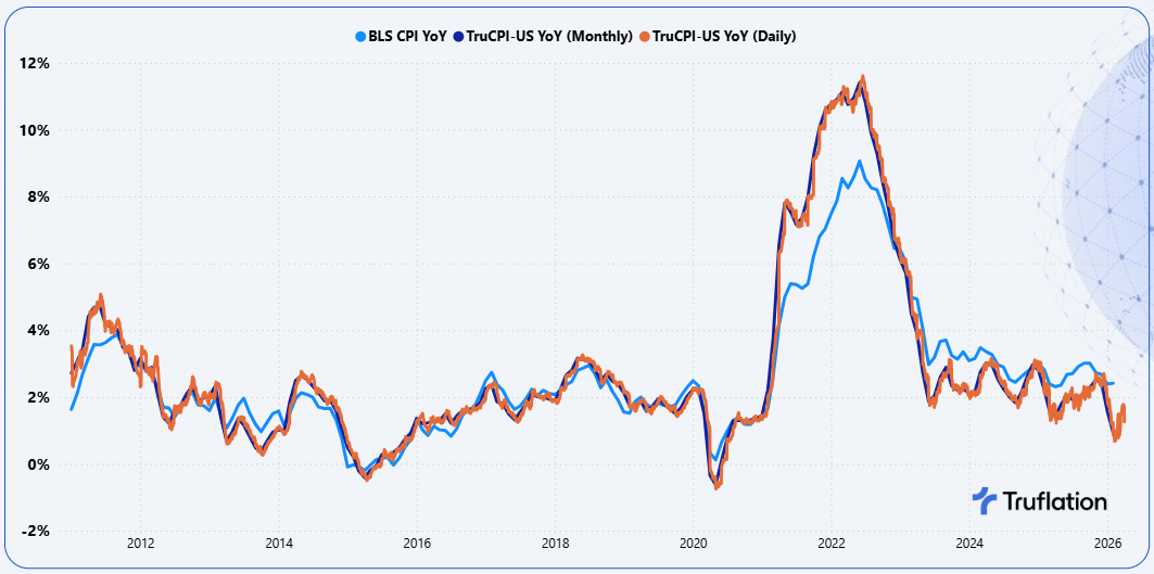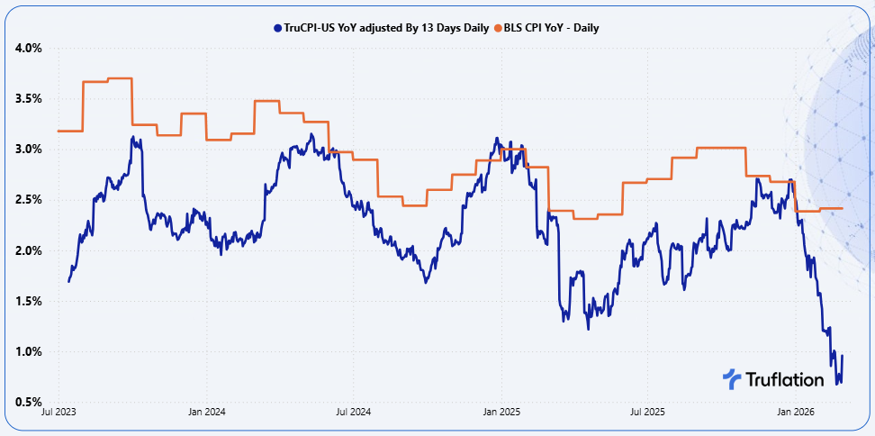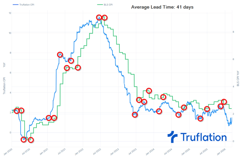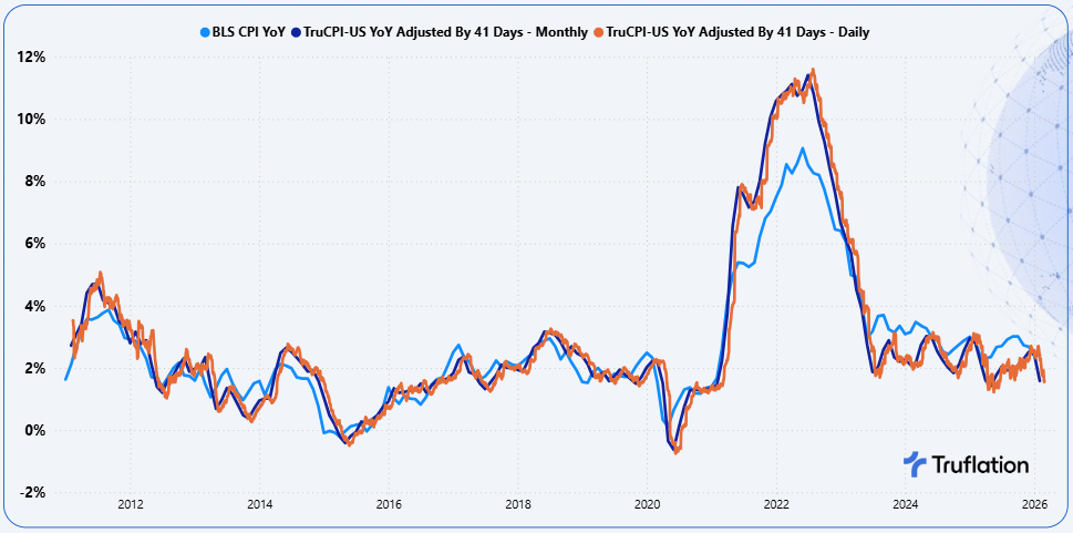 When adjusted for this lag, the correlation improves modestly to 0.962 (February 2011 to February 2026), further reinforcing Truflation’s role as a leading indicator.