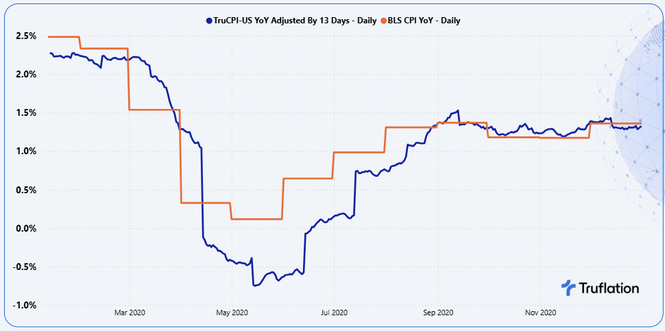 When the TruCPI-US series is lagged by 13 days and compared to the CPI published by the U.S. Bureau of Labor Statistics, the correlation coefficient is 0.959 with an R² of 0.926. This indicates that Truflation explains approximately 93% of the variation in CPI year-on-year movements within this regime.