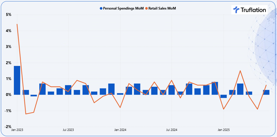 With the price increases occurring as a result of the new tariff policies, it will eat into real incomes, at a time when consumer spending is starting to look a bit shaky. Monthly retail sales and personal spending have started to cool in the last couple of months, despite the increase in prices. It is evident that spending on balance has stagnated for the first six months of the year which rarely happens outside of a recession.