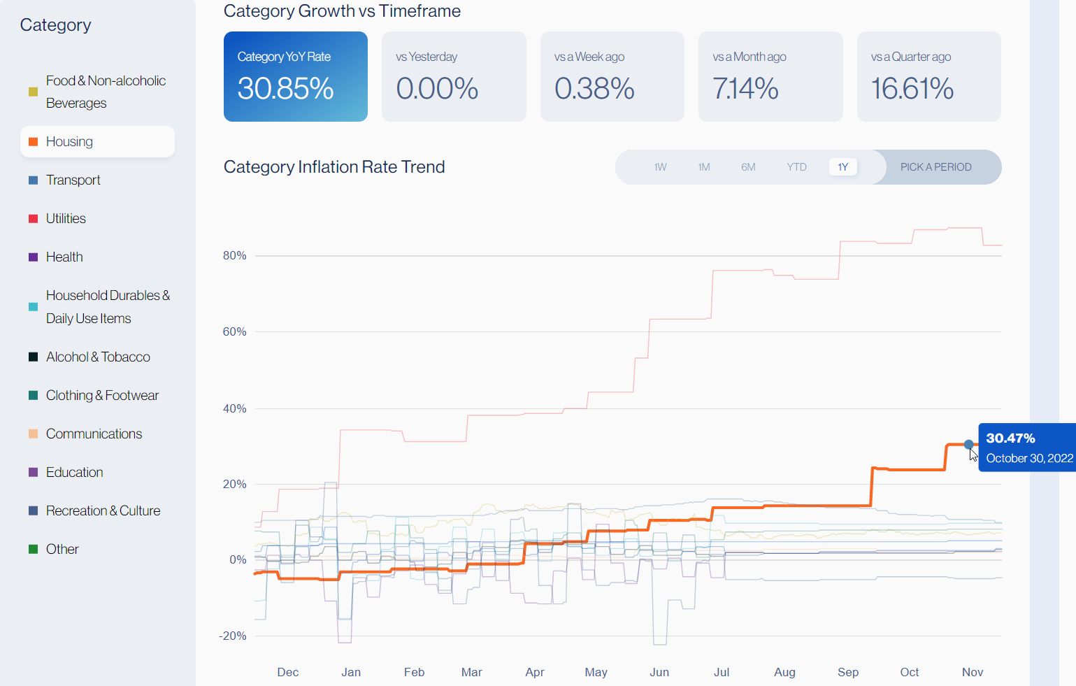 - The Housing category that includes owned dwellings, rented dwellings, and other lodging increased from 23.7% at the end of September to 30.5% at the end of October and 30.85% as of Nov 15, 2022. The category increased due to higher rents and mortgage rates, which reached 5.4% in October for the first time since 2008.