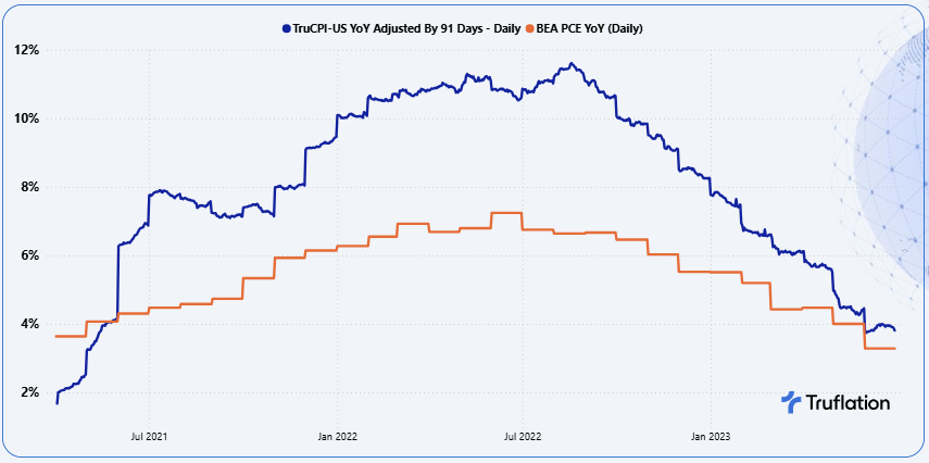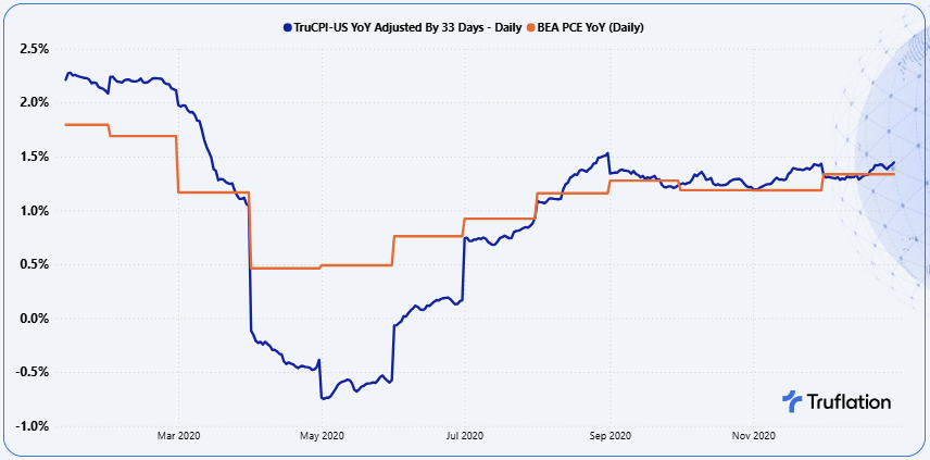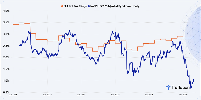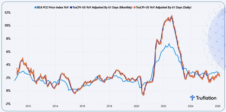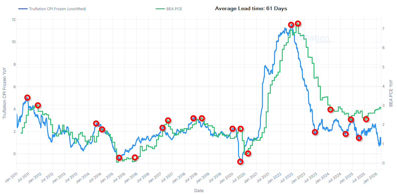 - Continuous updating as Truflation updates daily, while PCE is released monthly with a roughly 28-30 day publication lag. By the time PCE is published, the underlying economic conditions may have already shifted which Truflation has already captured.