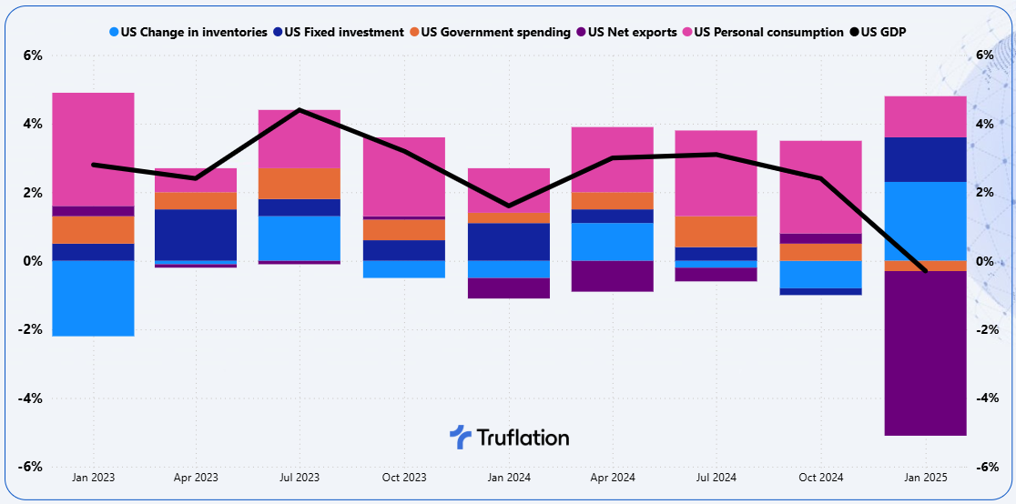 The US economy contracted at an annual rate of 0.3% in the first quarter of 2025, the first time in three years. This was primarily due to an astonishing 41% increase in imports (at an annualized rate) and is largely attributed to front loading in anticipation of tariffs. Assuming all else is equal, it is likely that the GDP growth will catch up as inventories are used up and the consumer continues to spend. However, given the dependency on overseas goods, this approach is only sustainable on a shorter horizon. Otherwise supply gaps will start to occur combined with increases in prices.