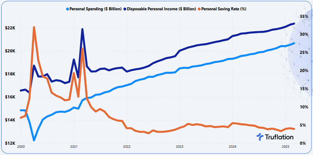 The other economic data is also conflicting; personal spending rose 2.3% on an annualized basis with the rate of growth falling from 2.7% growth. On the flip side retail sales increased 1.4% vs the previous month and is up 4.6% on an annualized basis. Are consumers front loading in anticipation for tariffs? Consumer confidence suggests otherwise, as it has plunged again in April for the fifth consecutive month, and falling to levels not seen since the onset of the pandemic.