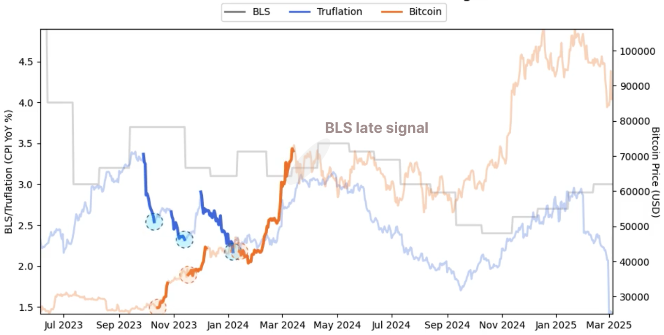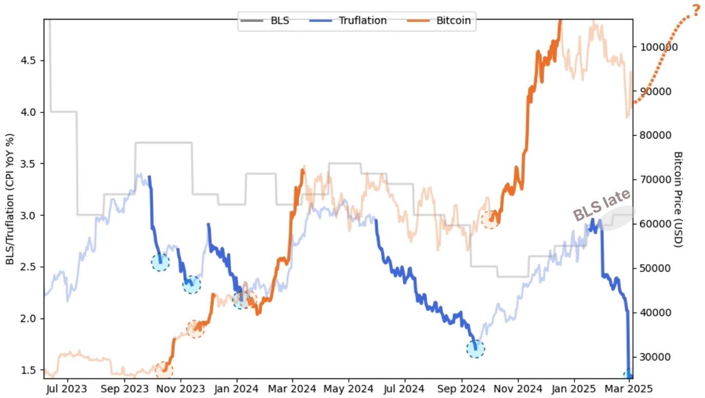 As of now (late March 2025), we’ve just seen another sharp Truflation downtrend — from 3.10% on Jan 19 to 1.30%, and it is slowly starting to go up, sitting currently at 1.80%. If the pattern holds, Bitcoin may be gearing up for another leg up!