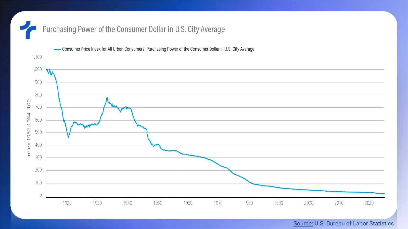 Since 1913, the purchasing power of the US dollar has fallen by 97%, according to the BLS. This implies a higher cost of living and often a drop in quality of life.