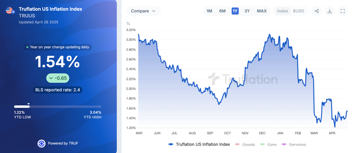Even though it is 45 days behind Truflation, the BLS is also already recording a drop in inflation. The CPI went from 3% (YoY) to 2.4% from January to March.